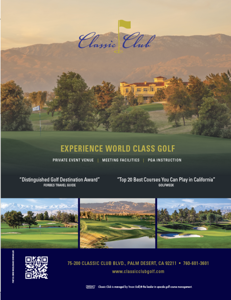 Classic Club delivers an exceptional golf experience, going above and beyond to ensure every visit is not only enjoyable but truly memorable. Designed by the legendary Arnold Palmer, this 18-hole Signature Course has been home to numerous professional and competitive events, including the PGA Tour’s Bob Hope Classic (2006–2008). With generous landing areas, yardages ranging from 4,219 to 7,322 yards, and elevated tee boxes offering 360-degree panoramic views of the surrounding mountains, Classic Club is a masterpiece of desert golf that both challenges and delights players of all skill levels. The course combines rolling terrain, wide fairways, and 30 acres of sparkling water features, with 14 beautifully designed bridges and an abundance of pine trees enhancing both strategy and scenery. With five sets of tees on every hole, golfers can choose the level of challenge that suits their game, making the course equally enjoyable for beginners and seasoned players.
